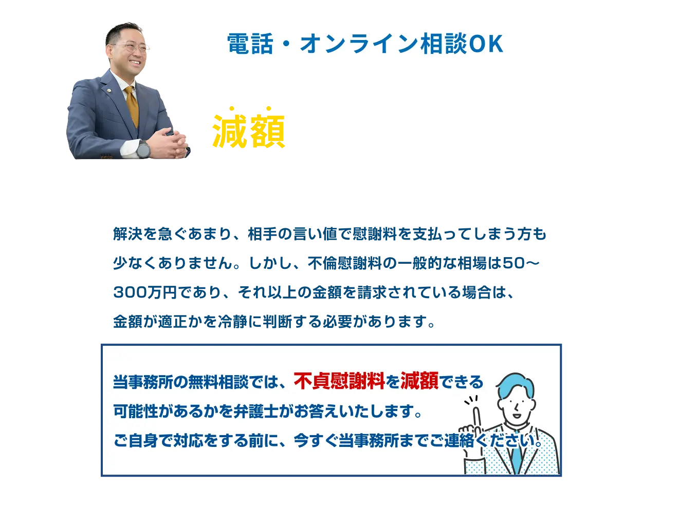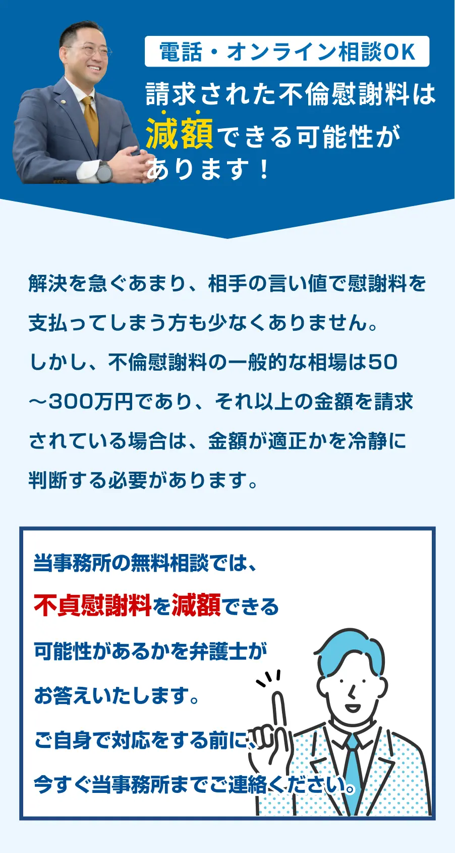Cさんは、Bさんと離婚の協議を進めている際中でもあり、より高額な慰謝料が請求される可能性もあったため、迅速な対応により、慰謝料金額を抑えることが出来た事案だといえます。